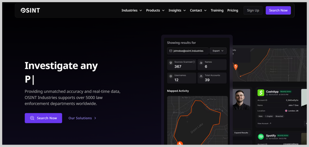 - OSINT อุตสาหกรรม: ซอฟต์แวร์นี้ใช้เครื่องมืออ้างอิงแบบเรียลไทม์เพื่อค้นหาบัญชีออนไลน์ทั้งหมดที่เกี่ยวข้องโดยตรงกับบุคคลที่ใช้อีเมลหรือหมายเลขโทรศัพท์