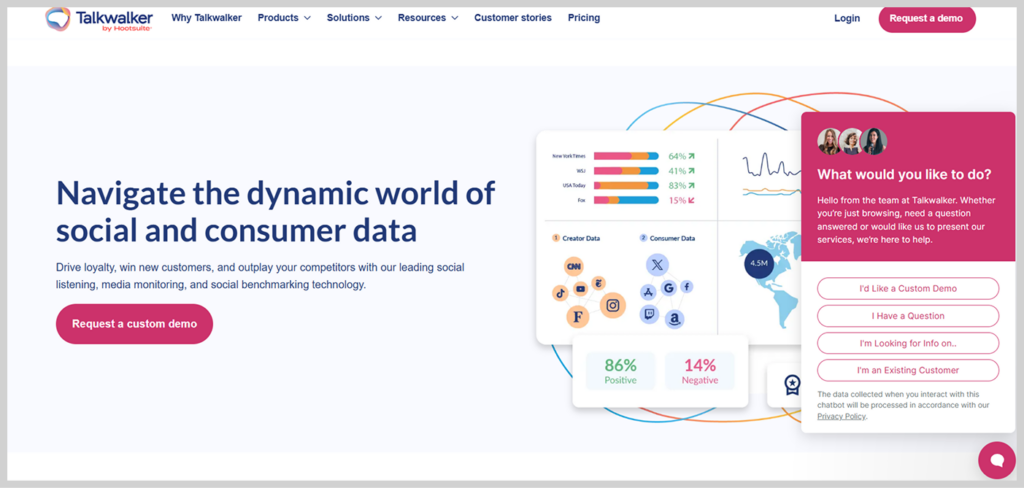 Talkwalker นำเสนอเครื่องมือชั้นนำของอุตสาหกรรมสำหรับการตรวจสอบเว็บ ในปี 2567Hootsuite เข้าซื้อกิจการ Talkwalker. แพลตฟอร์มนี้เหมาะอย่างยิ่งสำหรับทีมรักษาความปลอดภัยและหน่วยงานประชาสัมพันธ์ เนื่องจากสามารถสแกนผ่านแหล่งที่มานับล้านเพื่อค้นหาภัยคุกคามที่เกิดขึ้นใหม่ กับครอบคลุมกว่า 150 ล้านเว็บไซต์,ทอล์ควอล์คเกอร์รองรับมากกว่า 187 ภาษา.