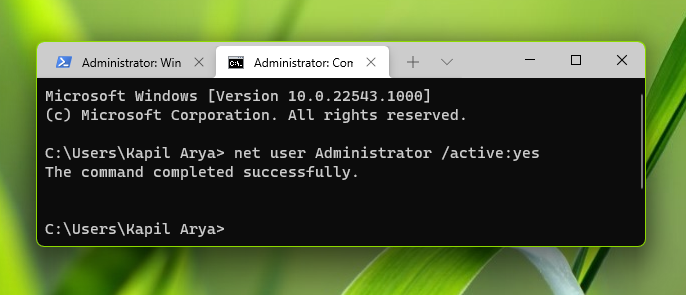 net user Administrator <password> /active:yesTrong lệnh trên, bạn cần thay thế<mật khẩu>bằng mật khẩu thực tế bạn muốn sử dụng với tài khoản quản trị viên.