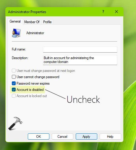 3. Trên bảng thuộc tính, tại tab General, bỏ chọnTài khoản bị vô hiệu hóalựa chọn. Nhấp vào Áp dụng, OK.