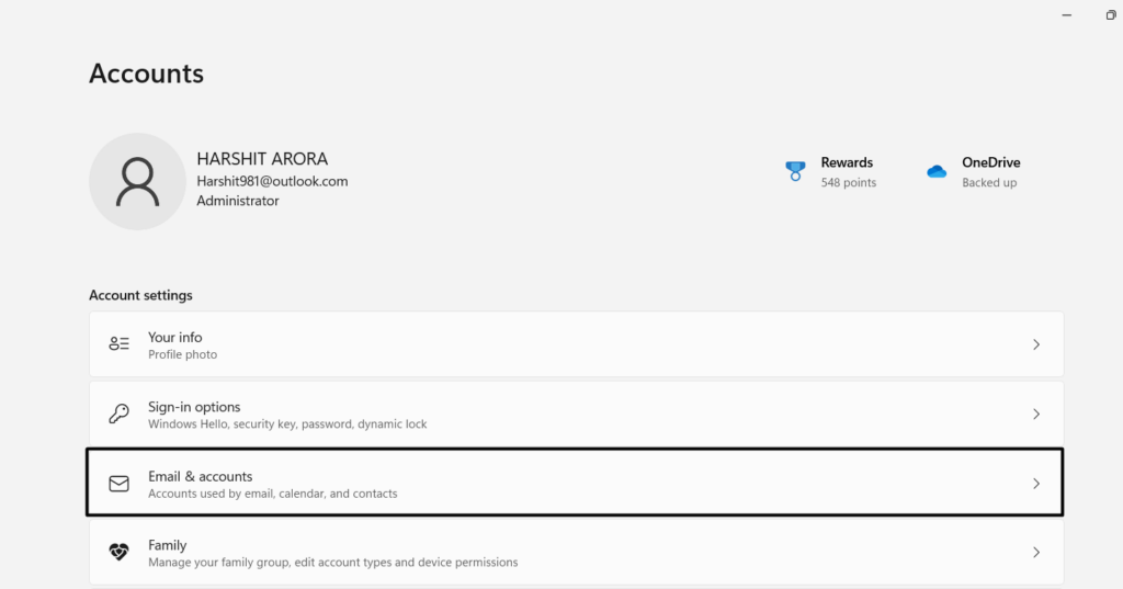 2.Từ thanh bên trái của ứng dụng Cài đặt, hãy chọnTài khoản, sau đó chọnEmail & tài khoản.