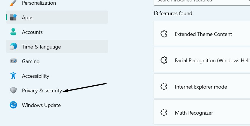 1.Khởi độngỨng dụng cài đặtvà từ thanh bên trái của nó, hãy chọnQuyền riêng tư và bảo mậtlựa chọn.
