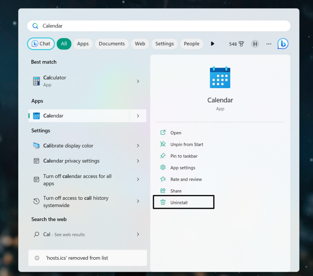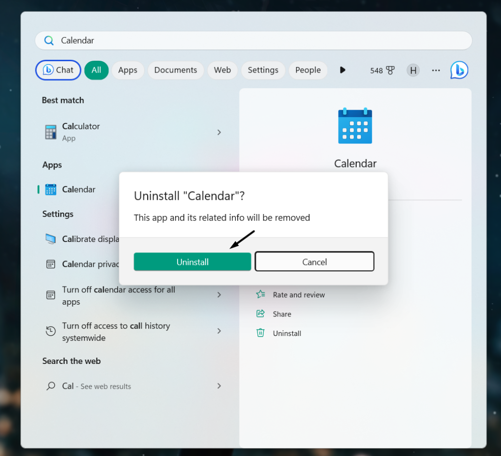 2.Trong kết quả tìm kiếm của Windows, hãy nhấp vàoGỡ cài đặtnút dướichương trình lịch.