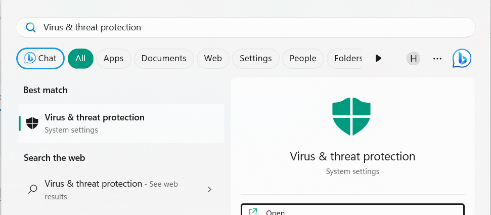 2.Trong hộp tìm kiếm, gõBảo vệ chống virus và mối đe dọatrong đó và chọn tương tự từ kết quả tìm kiếm.