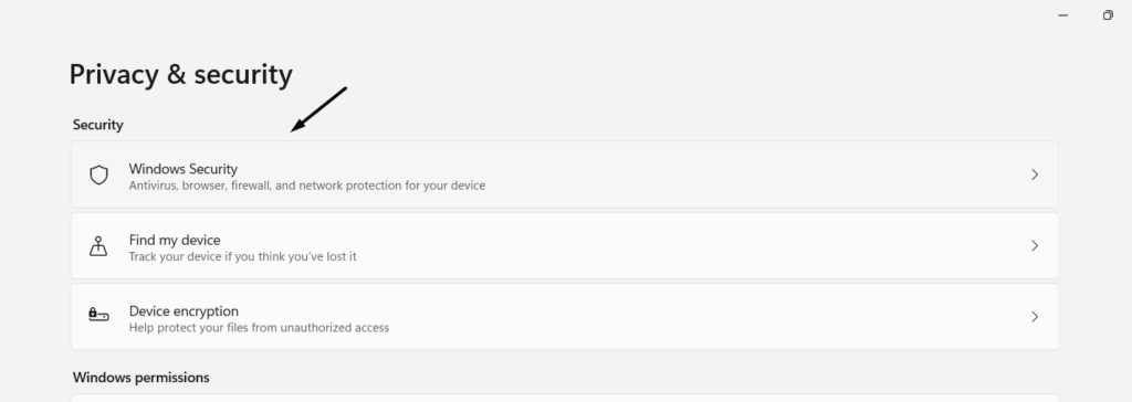 2.trongBảo vệphần, hãy chọnBảo mật Windowstùy chọn để truy cập tất cả các cài đặt quyền riêng tư.