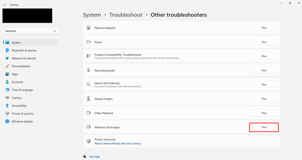 3. Chạy Trình khắc phục sự cố ứng dụng Windows Store