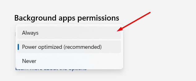 4.Cuối cùng, chọnLuôn luôntùy chọn từQuyền ứng dụng nềntrình đơn thả xuống.