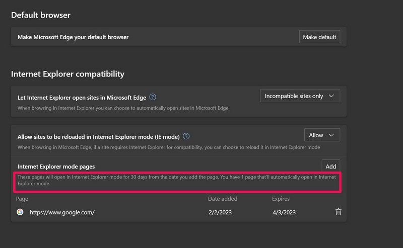 Ghi chú:Các trang bạn thêm vào danh sách chế độ IE trong Microsoft Edge sẽtự động hết hạn sau 30 ngàykể từ ngày bổ sung. Vì vậy, sau khi các trang hết hạn, bạn sẽ phải thêm chúng vào danh sách chế độ IE trong Edge một lần nữa.